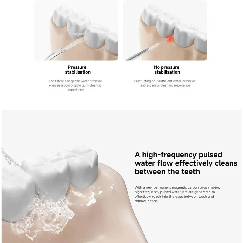 تمیزی عالی با ترکیب حباب و پالس تولید ۱۷۰۰ پالس در دقیقه تا ۹۹.۴% پلاک ها را از بین می برد دارای ۲ عدد نازل استاندارد و ارتودنسی حالت های فشار آب نرم، استاندارد و قدرتمند برای رفع نیازهای مختلف تمیز کردن مناطق غیر قابل دسترس توسط نازل ارتودنسی جلوگیری از آسیب به لثه ها