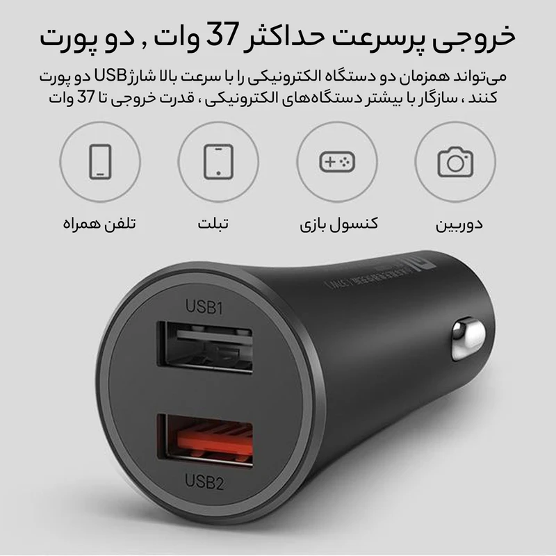 شارژر فندکی شیاومی مدل Mi 37w dual-port car charger دارای دو خروجی USB با توان شارژ دهی 37w می باشد که قابلیت شارژ کردن انواع گوشی تلفن همراه که دارای تکنولوژی شارژ سریع را می باشند را دارد . جنس بدنه فلزی و کیفیت ساخت بالایی برخوردار می باشد . Mi 37w dual-port محدودیتی در شارژ کردن دستگاه های تلفن همراه و یا تبلت برای این دستگاه وجود ندارد . دستگاه با ولتاژ انواع وسیله نقلیه با 12 و 24 به شما امکان شارژ را می دهد .پورت اول دستگاه قادر به خروجی 5 ولت 2 امپر و پورت دوم دستگاه 5 ولت 3 امپر ، 9 ولت 2 امپر ، 12 ولت 2.25 امپر و 20 ولت 1.35 امپر را دارا می باشد . عملکرد پورت های دستگاه با توجه به نیاز دستگاه شما می باشد و جریان اضافه ای به دستگاه شما وارد نمی کند .