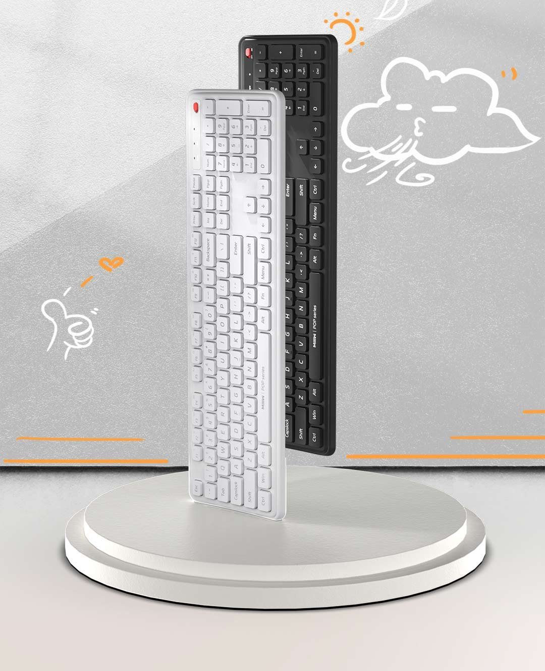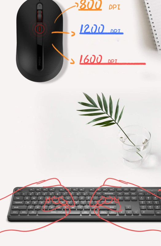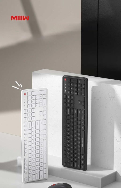دکمه های سایلنت و بی صدا  حاشیه بیشتر بین کلیدها برای تایپ سریع تر ⟿ طراحی صفحه کلید بی سیم شیائومی با زاویه شیب 6 درجه  کلید های دارای انحنا  سه حالت قابل تنظیم 800 ، 1200، 1600 برای DPI موس یک دانگل برای هر دو دستگاه  حالت بی سیم ( WiFi 2.6Ghz ) با برد 10 متر  طراحی کیبورد دارای 104 کلید در سه بخش (+NumPad) ، با Fn , Menu , …  باتری ماوس ( دو باتری نیم قلمی (AAA) قابل تعویض )