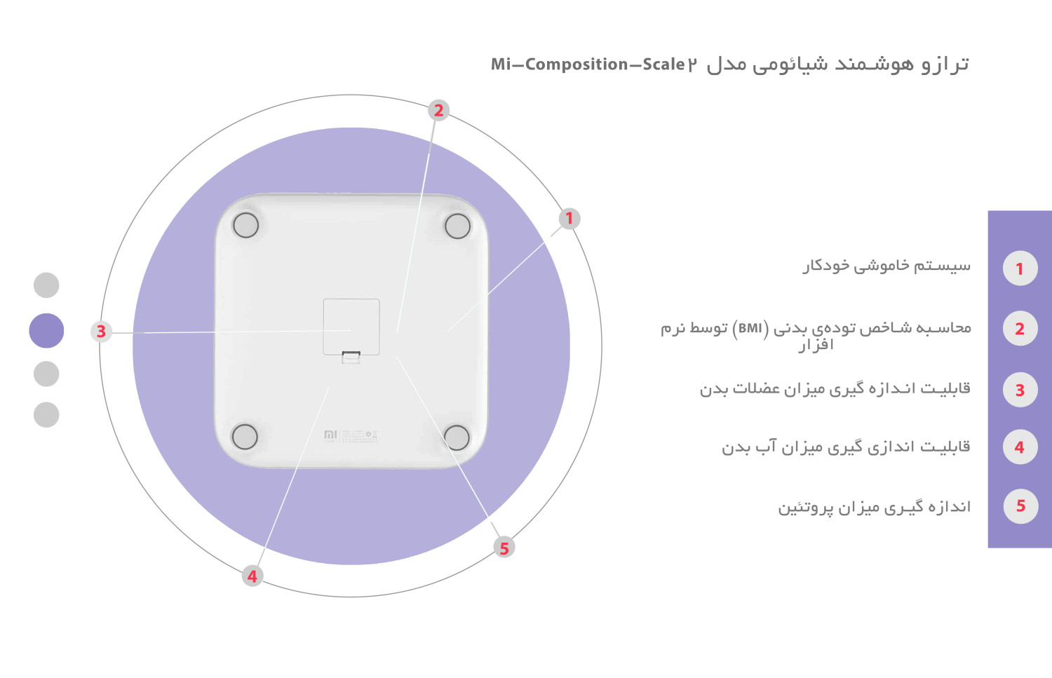 دارای ورژن بلوتوث ۵.۰ سازگار با سیستم عامل Android ۴.۴ و IOS ۹.۰ دقت بسیار بالا در اندازهگیری وزن کالیبراسیون خودکار قابلیت اتصال به گوشی هوشمند از طریق نرم افزار Mi Fit امکان ذخیرهی اطلاعات روی نرمافزار گوشی دارای تکنولوژی بیوالکتریکی (BIA) طراحی سطح بزرگ با گوشه های گرد کلاسیک و زیبا نمایشگر LED با نور سفید دارای پایههای لاستیکی که در کف ترازو جهت جلوگیری از لرزش و اندازه گیری دقیق وزن