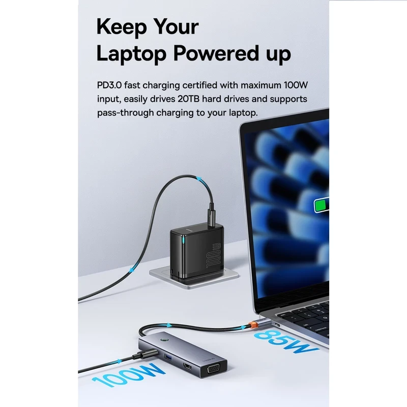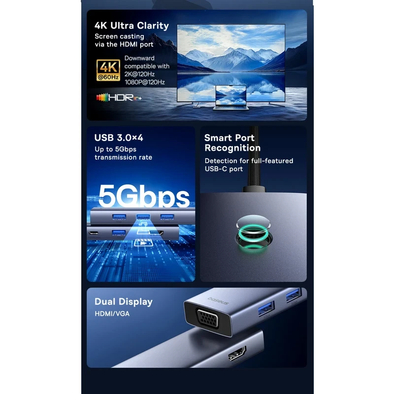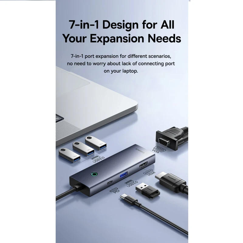 هاب 7 پورت باسئوس مدل UltraJoy یک ابزار چندکاره و قدرتمند است که با پشتیبانی از کیفیت تصویر 4K@60Hz و سرعت انتقال داده 5Gbps، تجربه کاربری شما را ارتقا میدهد. این هاب دارای پورت HDMI برای نمایش تصاویر با وضوح بالا، چهار پورت USB 3.0، یک پورت USB-C PD با توان 100 وات، و یک پورت VGA است. با قابلیت قطع اتصال سریع و لایه های مختلف امنیتی، این هاب به شما اجازه میدهد تا چندین دستگاه را به طور همزمان و با اطمینان کامل مدیریت کنید.