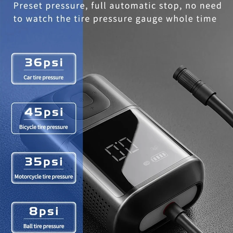 ظرفیت باتری: ۲۶۰۰ میلی آمپر ساعت | تنظیم فشار بین ۴ تا ۱۵۰ PSI | چراغ LED با امکان هشدار SOS | اندازه گیری آسان و دقیق فشار هوا با خطای ۰.۱ بار | ۵ حالت پیش فرض باد زن خودرو / موتور سیکلت / توپ / دوچرخه / فشار دلخواه | دارای نمایشگر LED