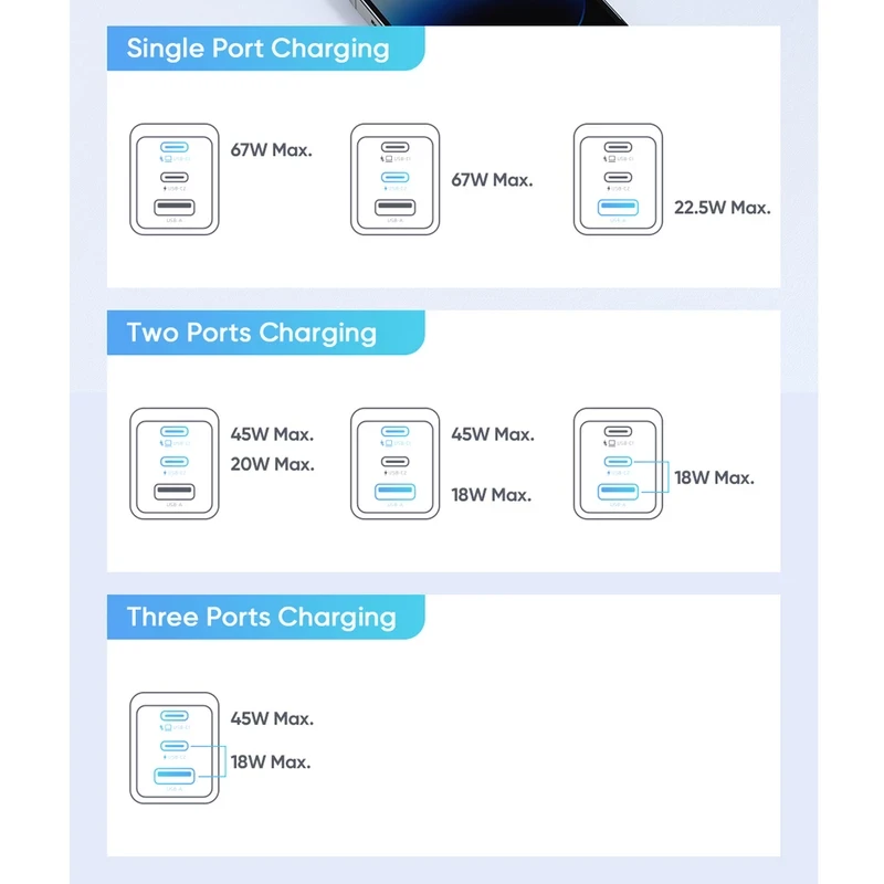 USB-C۱+USB-C۲:۴۵W+۲۰W(۶۵W Max.) USB-C۱+USB-A:۴۵W+۱۸W(۶۳W Max.) USB-C۲+USB-A:۵V⎓۳.۶A(۱۸W Max.) USB-C۱+(USB-C۲+USB-A):۴۵W+۱۸W(۶۳W Max.)