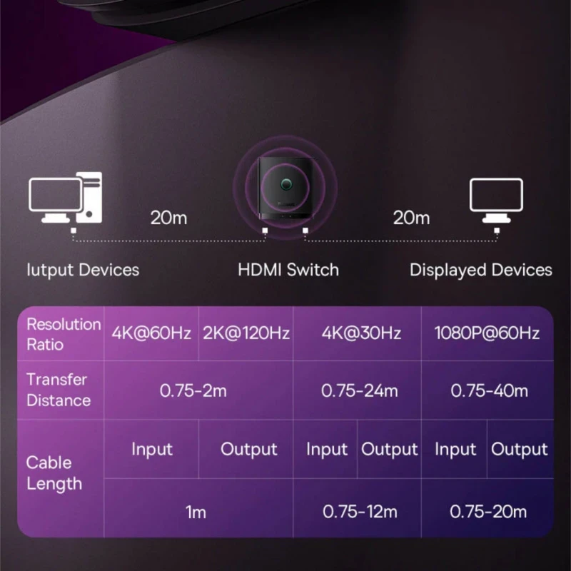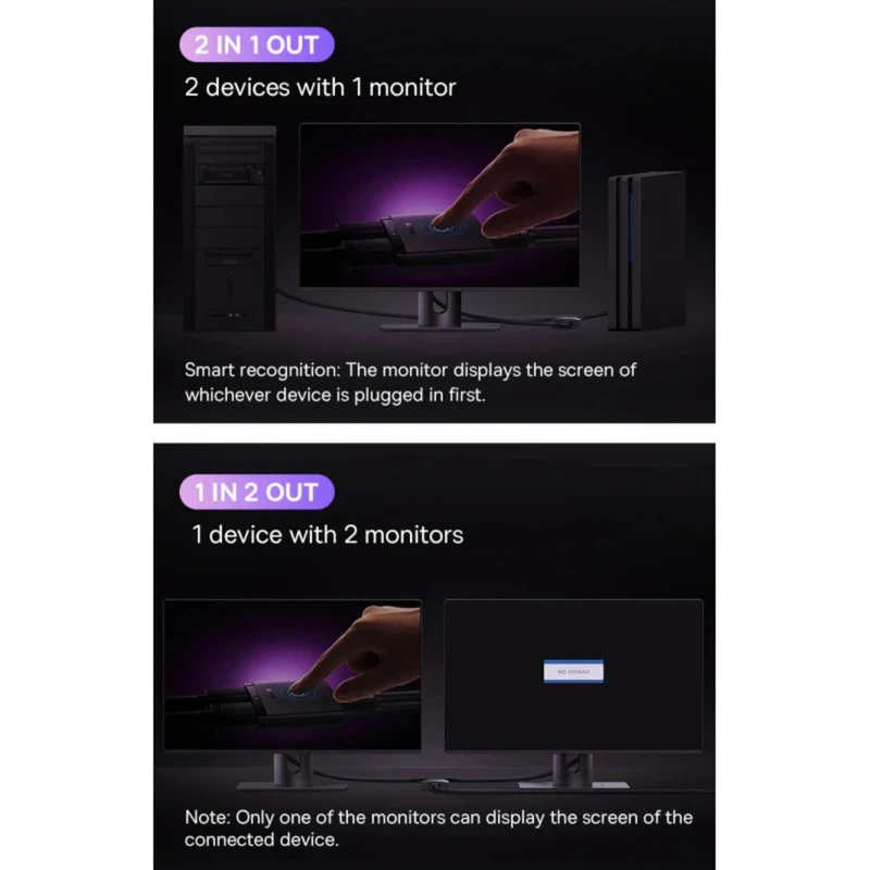 مبدل اچ دی ام آی دو در یک بیسوس Baseus AirJoy Series 2-in-1 Bidirectional HDMI Switch B01331105111-00 برای انتقال همزمان تصویر و صدا به صورت دیجیتال نیاز به کابلی داریم که امکان این اتصال و انتقال را برای ما فراهم کند. برای تماشای سریال مورد علاقه خود که در لپتاپ ذخیره است و قصد تماشای آن را به صورت دستهجمعی داریم و یا برای فراهم کردن امکان بازی در صفحه نمایشی بزرگتر به کابلی به نام HDMI نیازمندیم که تصاویر و صدا را به بهترین و باکیفیتترین شکل ممکن ارائه دهد و تداخلی در صدا و تصویر ایجاد نشود. برای این منظور کمپانی بیسوس محصولی با عنوان Baseus AirJoy Series 2-in-1 Bidirectional HDMI Switch B01331105111-00 را طراحی کرده که با داشتن سه درگاه اچ دی ام آی نیاز شما را برای داشتن یک مبدل بسیار باکیفیت، رفع کرده است. ساختار مبدل انتقال تصویر و صدا : بدنهی این محصول بیسوس را ترکیب پلاستیک ABS و پلیکربناتنسوز تشکیل داده که آن را بسیار بادوام و در برابر آسیب مقاوم کرده است. ابعادی برابر با 56x52x15 میلیمتر دارد و فضای کمی از میز شما را اشغال میکند. طراحی آن بسیار ساده است و یک چراغ نشانگر سبز رنگ در ساختار آن خودنمایی میکند. با کمک آن می توانید ویدیو را از یک کنسول بازی (پلی استیشن 4، پلی استیشن 5، ایکس باکس، نینتندو سوییچ)، رایانه یا لپتاپ روی مانیتور، تلویزیون یا پروژکتور نمایش دهید. تصاویری باکیفیت 4K هاب اچ دی ام آی B01331105111-00 از وضوح تصویر 4K با نرخ تازه سازی 60 هرتز برخوردار بوده و میتواندرنگهای واضح و تصاویری با جزئیات غنی را در اختیار شما قرار هد. دارای دو حالت اتصال روی بدنه آن سه درگاه HDMI طراحی شده و امکان اصال در دو حالت برای شما فراهم است. به این صورت که در حالت 2 IN 1 OUT، میتوانید دو دستگاه را به یک صفحه، به عنوان مثال یک مانیتور، متصل کنید. در این حالت ابتدا تصویر تجهیزات متصل شده نمایش داده میشود. حالت 1 IN 2 OUT به شما امکان میدهد یک دستگاه را به دو نمایشگر متصل کنید. با نشانگر داخلی از وضعیت آداپتور مطلع خواهید شد. توجه: در حالت 1 IN 2 OUT، تنها یک صفحه می تواند تصویر دستگاه متصل را نمایش دهد. به صورت هوشمند منبع سیگنال را تشخیص میدهد و نیازی به انتخاب منبع سیگنال نخواهید داشت.