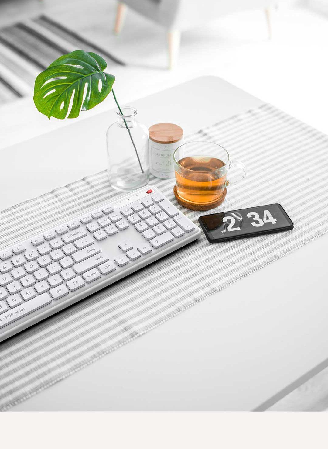 دکمه های سایلنت و بی صدا  حاشیه بیشتر بین کلیدها برای تایپ سریع تر ⟿ طراحی صفحه کلید بی سیم شیائومی با زاویه شیب 6 درجه  کلید های دارای انحنا  سه حالت قابل تنظیم 800 ، 1200، 1600 برای DPI موس یک دانگل برای هر دو دستگاه  حالت بی سیم ( WiFi 2.6Ghz ) با برد 10 متر  طراحی کیبورد دارای 104 کلید در سه بخش (+NumPad) ، با Fn , Menu , …  باتری ماوس ( دو باتری نیم قلمی (AAA) قابل تعویض )