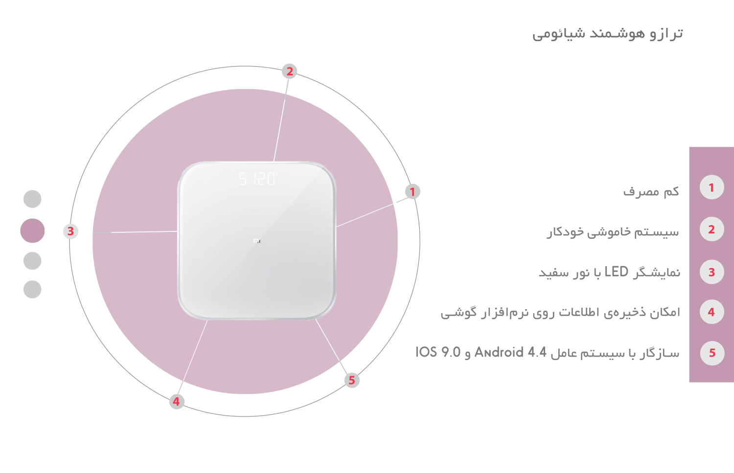 - محاسبه شاخص تودهی بدنی (BMI) توسط نرمافزار - دارای ورژن بلوتوث ۵.۰ - سازگار با سیستم عامل Android ۴.۴ و IOS ۹.۰ - کالیبراسیون خودکار - قابلیت اتصال به گوشی هوشمند از طریق نرم افزار Mi Fit - امکان ذخیرهی اطلاعات روی نرمافزار گوشی - قابلیت انتقال اطلاعات به گوشی هوشمند - طراحی کلاسیک و زیبا - نمایشگر LED با نور سفید - سیستم خاموشی خودکار - دارای پایههای لاستیکی که در کف ترازو جهت جلوگیری از لرزش و اندازه گیری دقیق وزن - کم مصرف